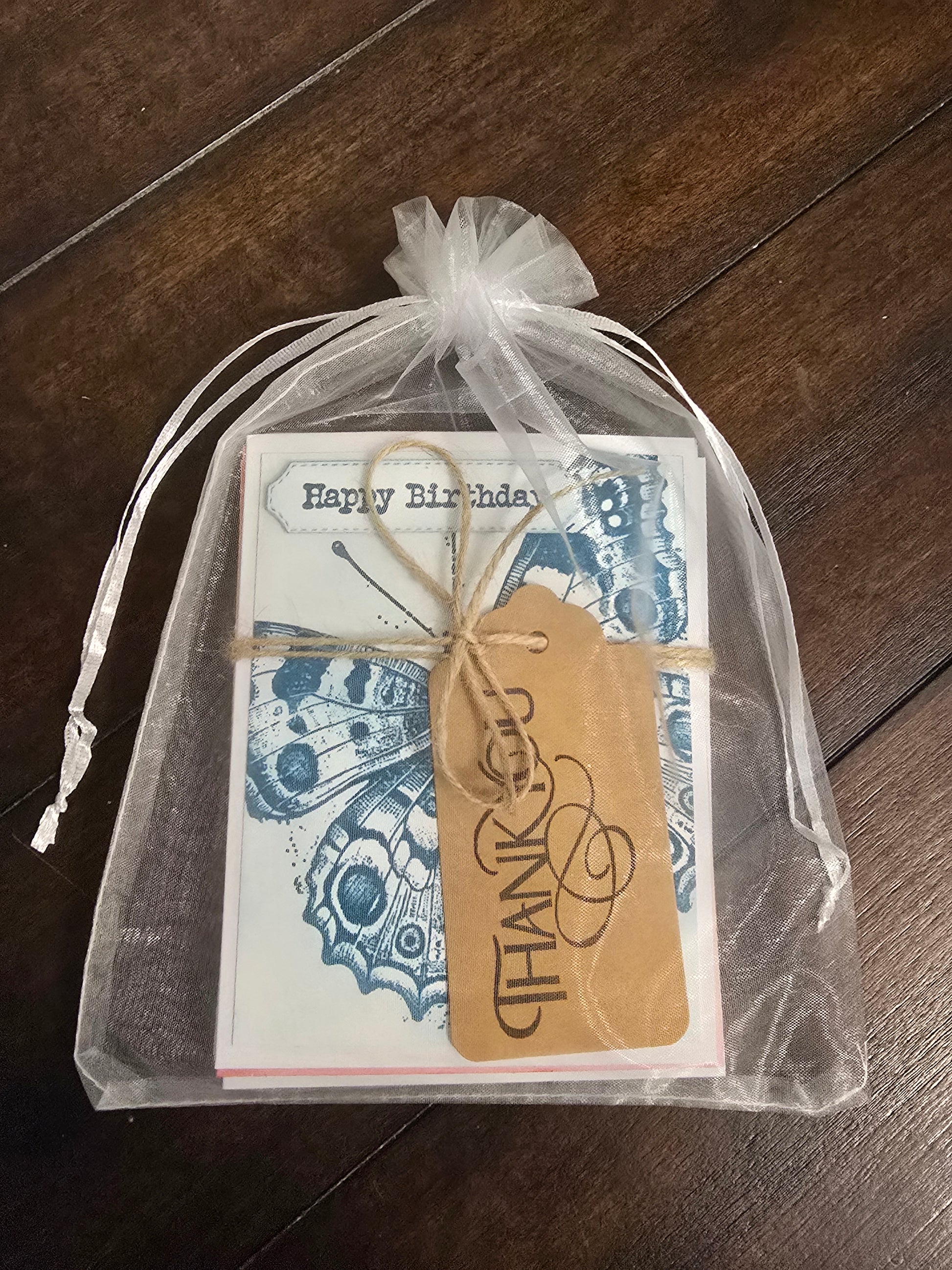 - This set is ready to gift in a white organza drawstring bag and a piece of twine holding the cards together, adorned with a tag that has "Thank You" on one side and our logo stamp on the other side