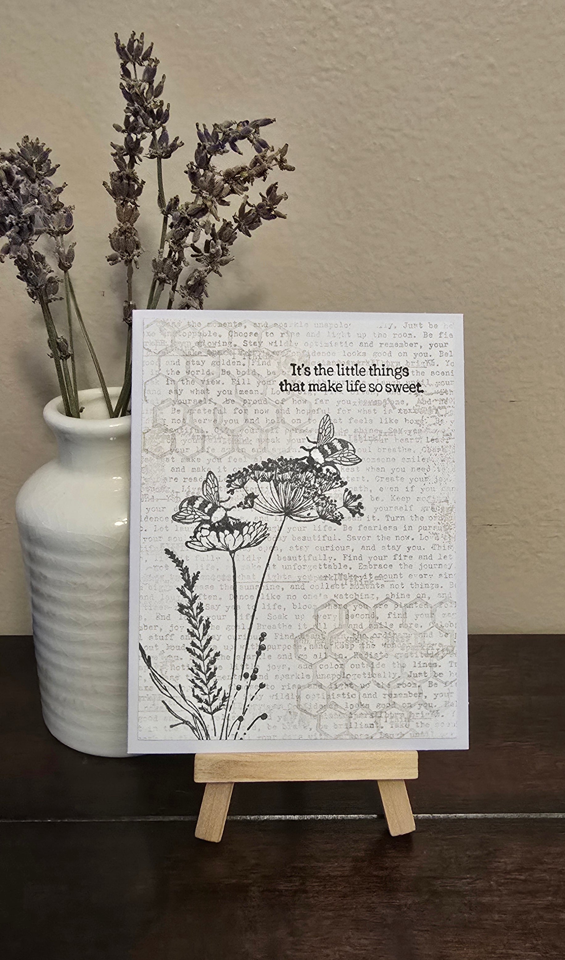 - Flowers, bees, butterfly, typed words, book pages, gold foil, embossed, raised sentiment tags, Halloween, Hello, Thank You, Happy Birthday, Blank Inside
