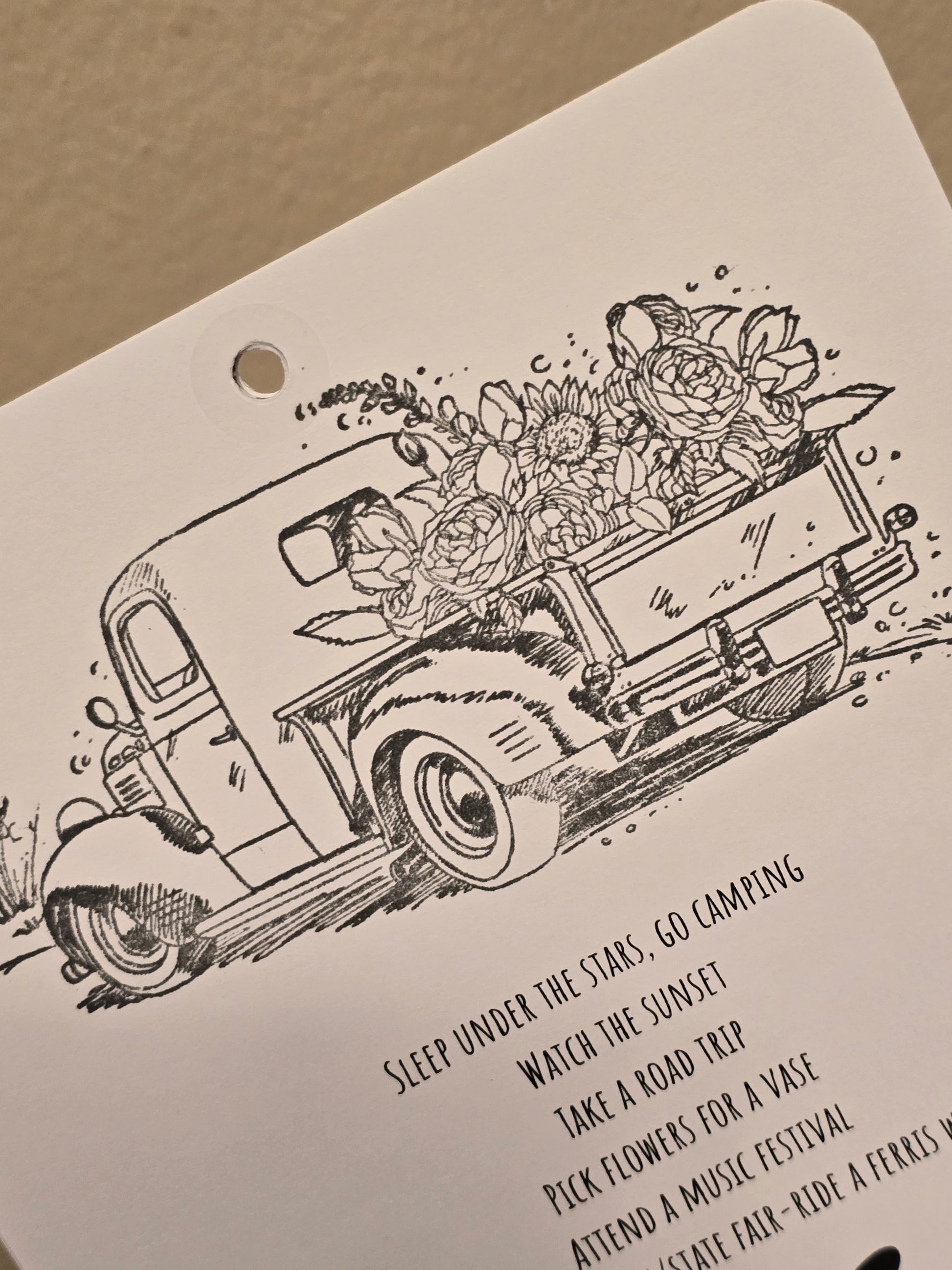 - Each month has a gray pigment ink hand stamped image at the top, with the month printed in a bold cursive text among the middle of the bucket list ideas