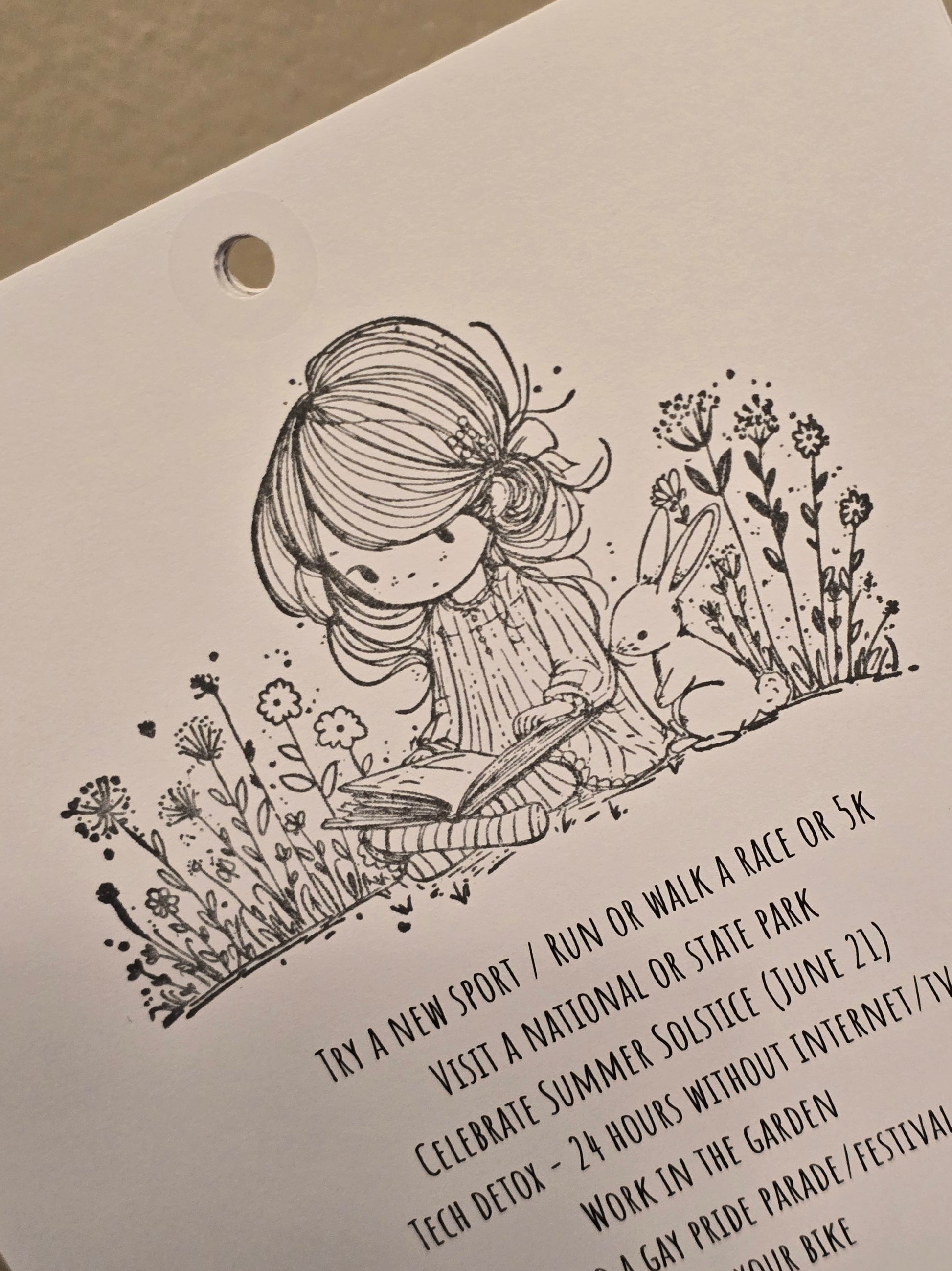 - June - A young girls reading a book among flowers, with her bunny friend