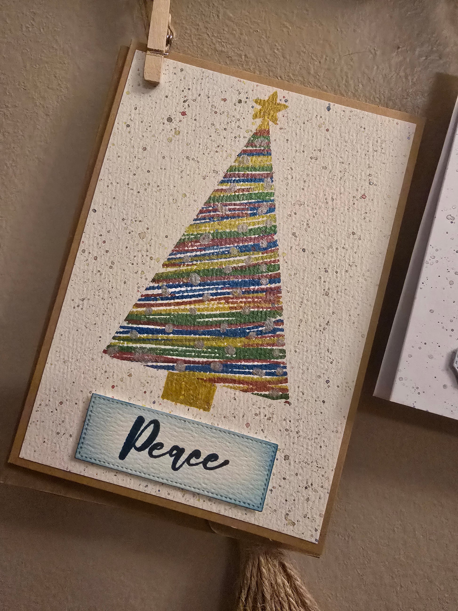 - A colorful and shimmery Christmas tree adorns a layer of textured 140lb watercolor paper
