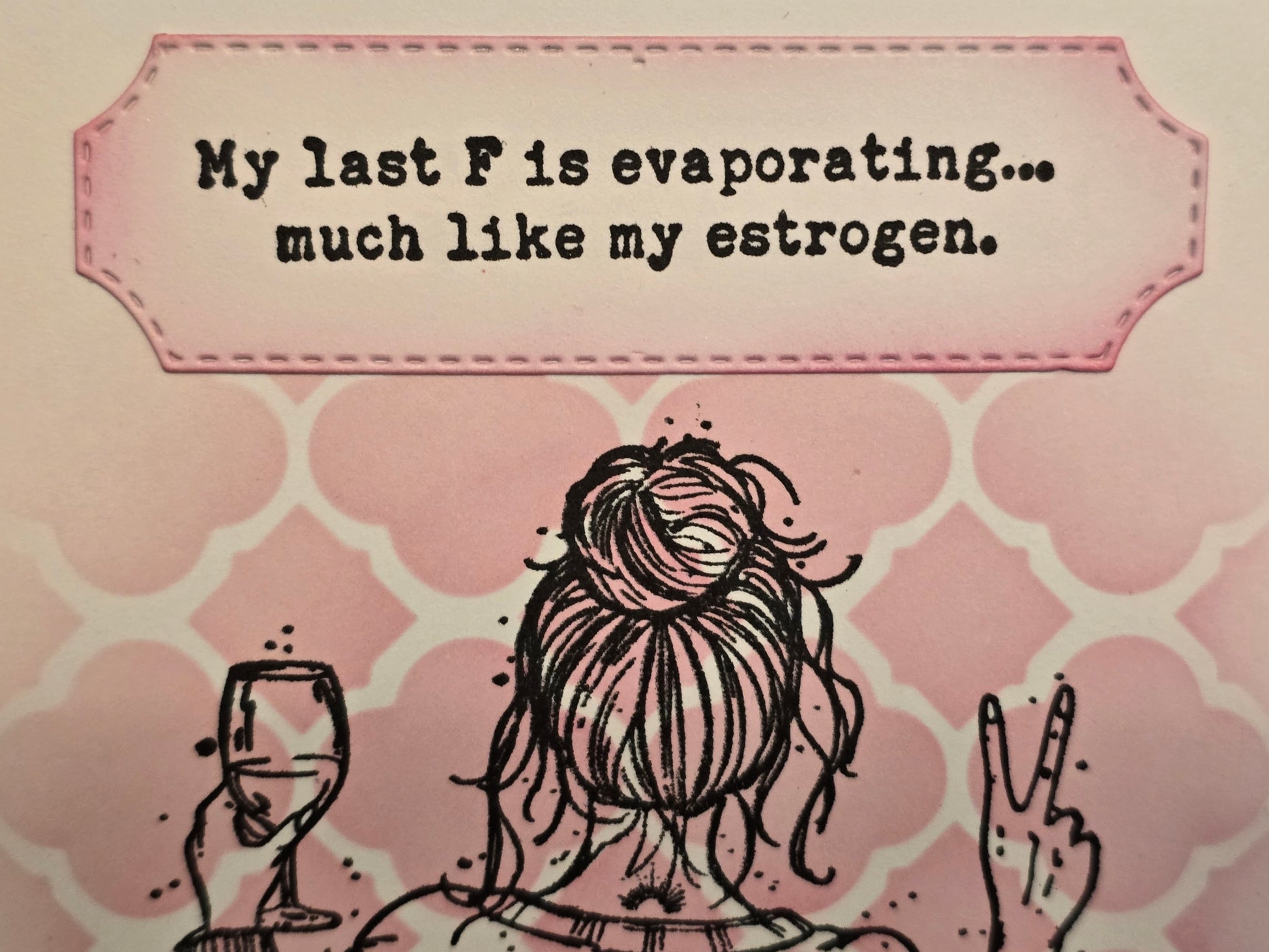 - Hand stamped sentiment "My last F is evaporating... much like my estrogen." is accented atop a cardstock tag with pink blended ink edges